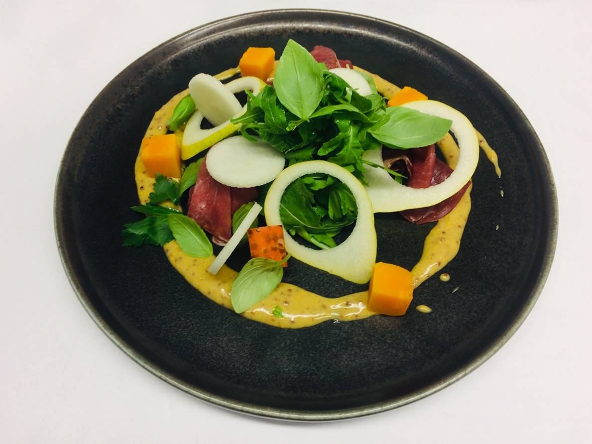 Krásný a barevný pokrm, kde dominuje bresaola v kombinaci s hruškou a dýní, hodící se ke skleničce bílého vína.