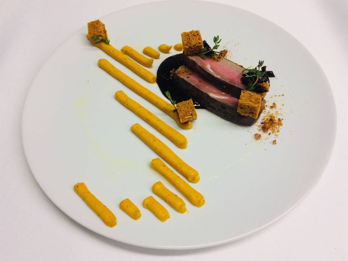 Exkluzivní pokrm z dančího hřbetu je servírován s perníkovou omáčkou s červeným vínem. Na jemnosti celého pokrmu přidává jemné purée z pečené dýně.