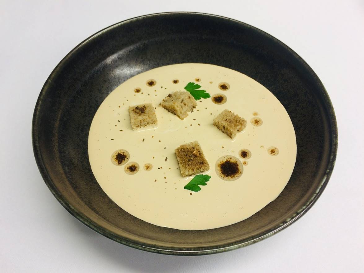 Klasické a známé chutě v moderním pojetí, takový je hříbkový krém zdobený kmínovým olejem.