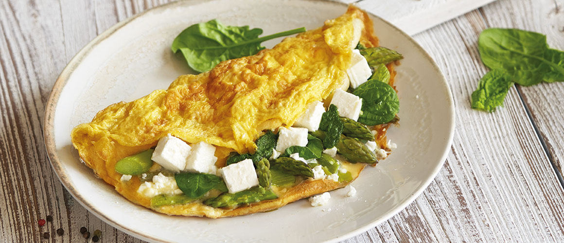 Do mísy rozklepněte všechna vejce, osolte, opepřete a prošlehejte. Rozpalte pánev a pokapejte olejem. Papírovým ubrouskem olej rozetřete a nalijte ¼ vajec. Vejce nechte zatáhnout, a až bude zespodu omeleta pevná, na jednu polovinu nasypte ¼ špenátu a chřestu. Vše zasypte 60 g fety nakrájené na kostičky a přiklopte druhou polovinou omelety.