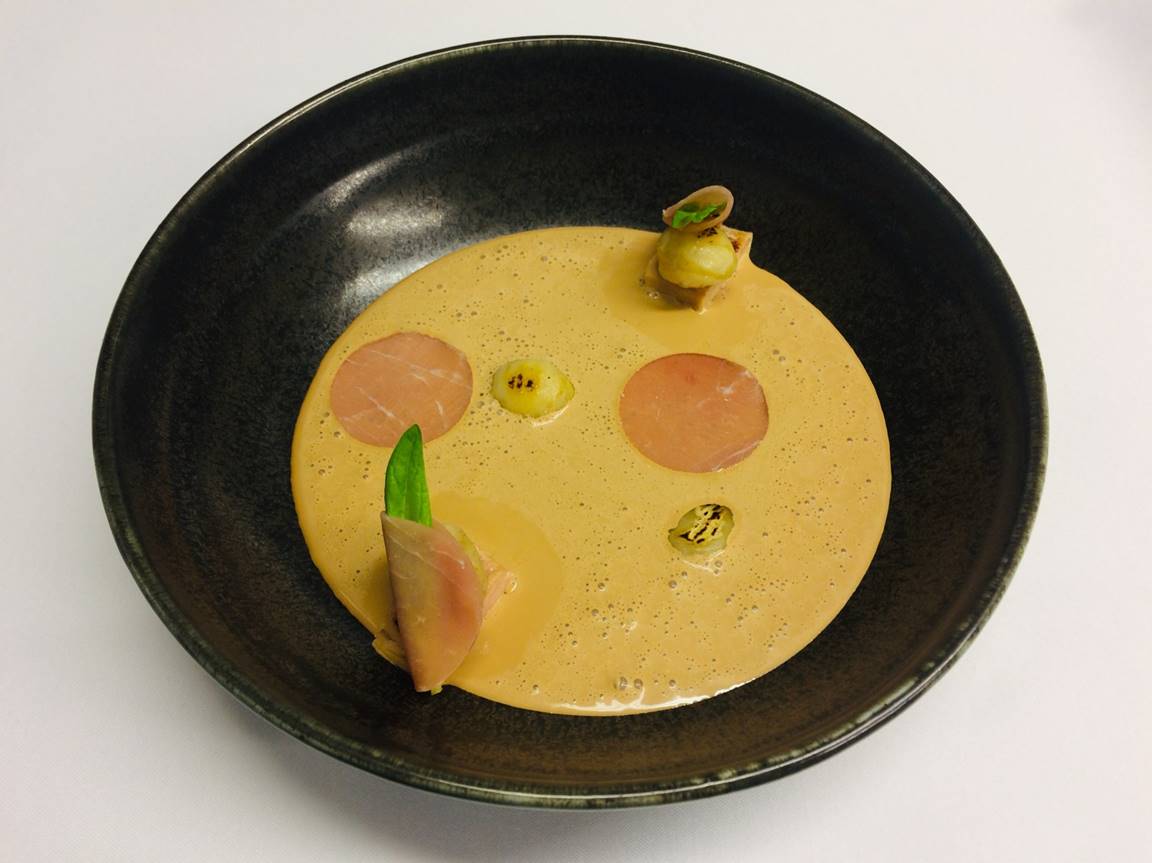 Kaštany jsou krásnou sezonní surovinou a jemný krém v kombinaci s foie gras a sušenou šunkou je vyzdvihne ještě výš.