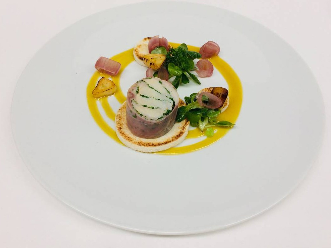 Výborný předkrm z lokálních surovin. Libové králičí maso zvýrazněné pancettou, doplněné o křupavý ochucený toast s lehkým salátkem.